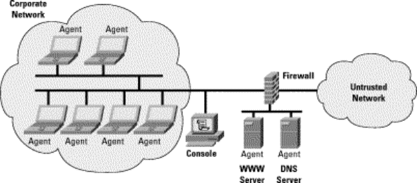 - Agent - software running on host computers, detects breaches of security policy from file access and security logs and reports to a central manager