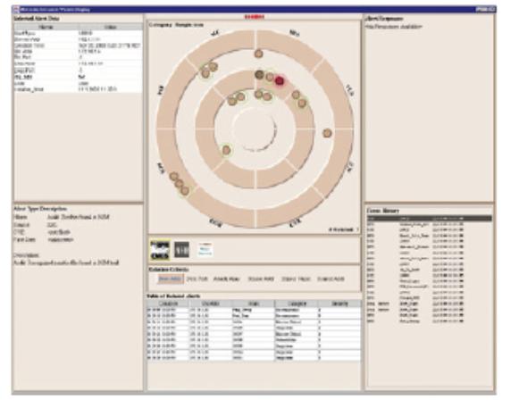 The IV product has a distinctive circular graphic in the screen, where the severity of the attack determines the location in one of the concentric circles (Appendix 6). Drill-down functions are provided to find out more about event history and analyse the raw data, if required. A GUI allows the security officer to define the system to respond to combinations of alerts, and this allows the handling of the lower level of security incidents by 'less experienced staff' (Motorola 2001).