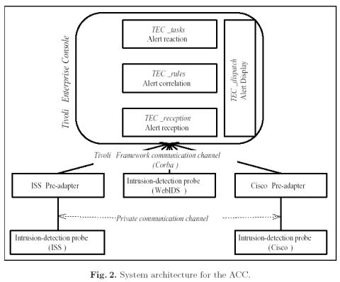 'The purpose of the ACC is to correlate the output of several probes and give the operator a condensed view of the reported security issues' (Debar & Wespi 2001, p. 86). Alerts to the ACC are sent in the standard IDWG message exchange format (IETF 2001).