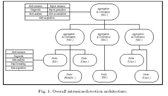 The architecture of Debar and Wespi's system in Appendix 4 shows how different software applications and network devices, probes, have been integrated into a NIDS, working under a network management system. Non-Tivoli aware probes can be connected to the system by using probe-specific pre-adapters. The probes need to be synchronised because unified time is needed for alerts. (p.96).